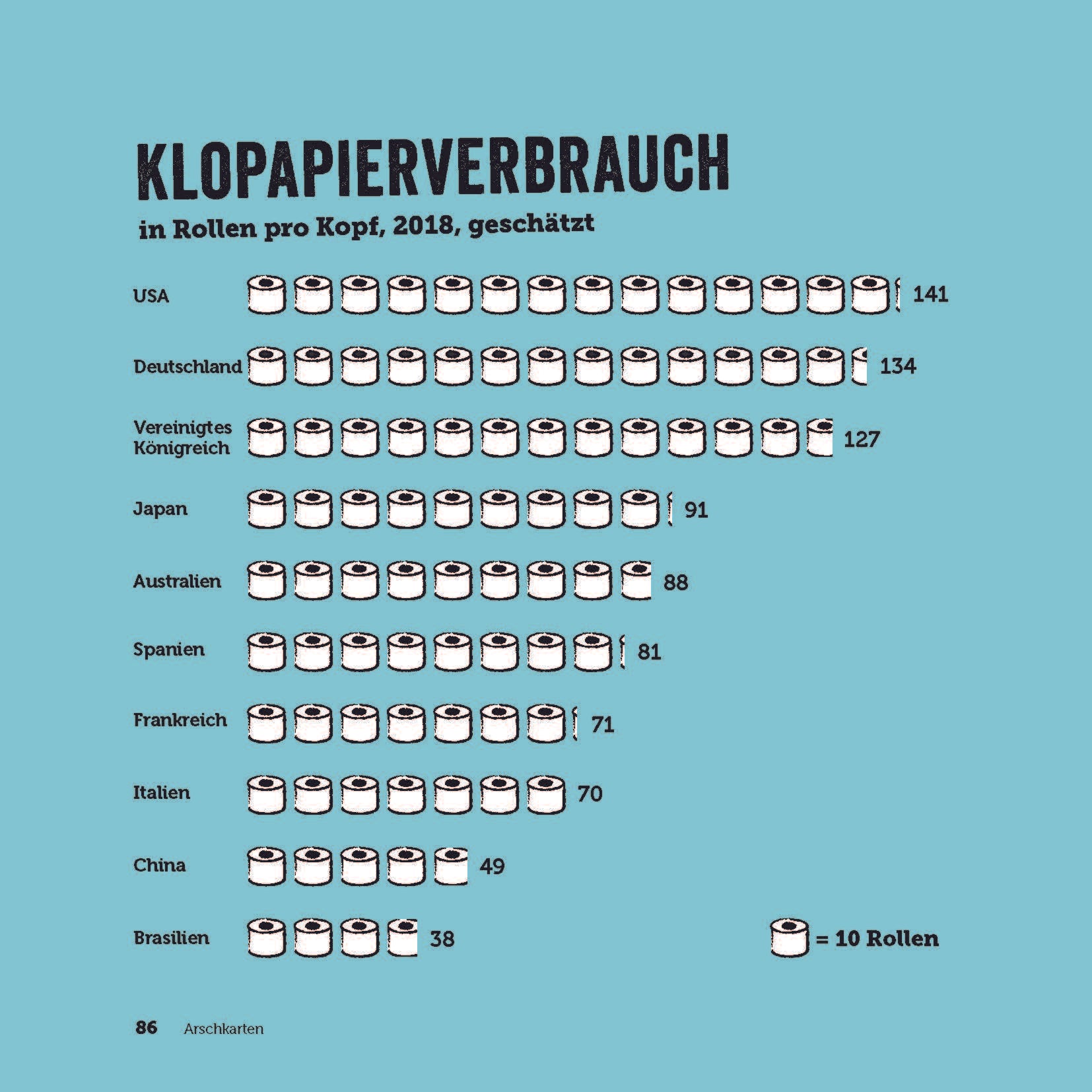 Das am meisten benutzte Toilettenpapier (laut Statista etwa 60% der Deutschen) ist immer noch Toilettenpapier aus Frischfaser. Frischfaser-Papier heißt: Für den Zellstoff des Klopapiers werden Bäume gefällt. Zwischen 60 und 70% der Energie für Frischfaser-Toilettenpapier werden allein für die Forstwirtschaft verbraucht. Dazu kommen die Produktion als Energiefresser, der Transport und der Eingriff in Ökosysteme durch die Abholzung. Keine gute Bilanz.