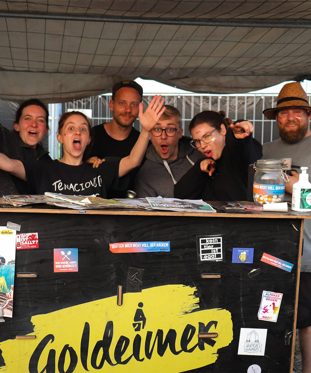 Hinter den Klos muss Goldeimer genauso viel Spaß machen, wie auf den Klos – das ist unser Grundsatz. Bis zu 250 Ehrenamtliche sind in jedem Jahr mit dabei, um eine gute Zeit zu haben und den Festivalbesuchenden ein traumhaftes Geschäft zu ermöglichen. Goldeimer sind immer betreut, sauber, voll ausgestattet und beleuchtet. In der Festivalcrew sind alle willkommen.