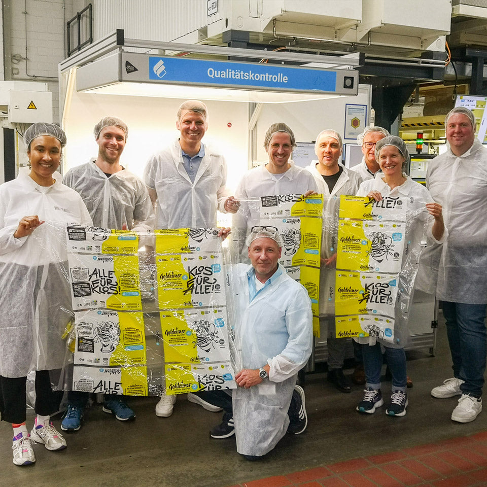Da ist das Ding! Im Februar 2024 halten wir die Goldeimer Verpackung mit WILDPLASTIC®-Anteil in der Produktionshalle von WEPA in den Händen. Ihr könnt euch vorstellen, wie groß die Freude ist!