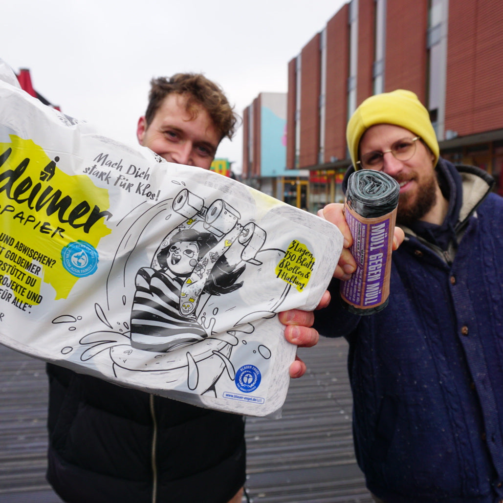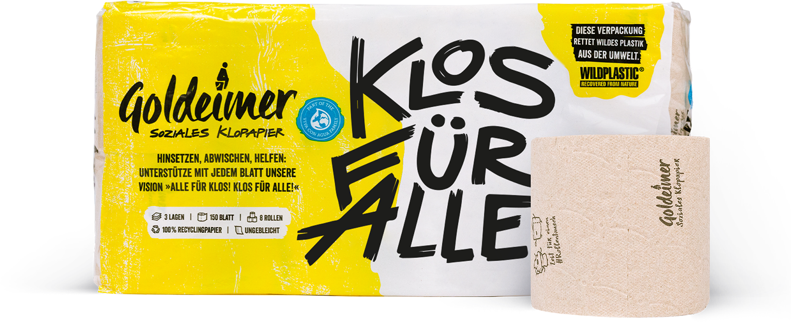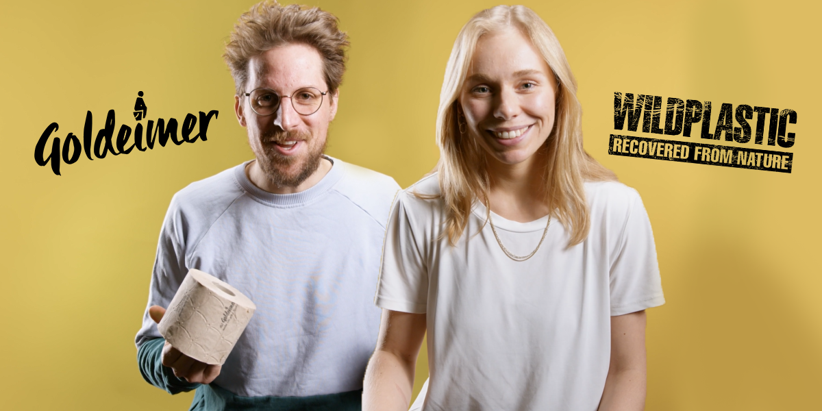 Eine Klopapier-Verpackung, die wildes Plastik aus der Umwelt rettet. Goldeimer und WILDPLASTIC® gehen die Plastik- und die Sanitärkrise an.