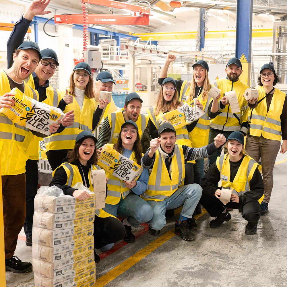 Seit Oktober 2023 wissen wir, dass es in WILDPLASTIC® verpacktes Goldeimer-Klopapier geben wird. Das Ergebnis dieser langen, intensiven und komplexen Reise ist mit bloßem Auge kaum zu erkennen. Es ist eine Verpackung, die jeder anderen gleicht – aber sie macht einen großen Unterschied. Goldeimer ist nun das erste Klopapier, das die Welt aufräumt.
