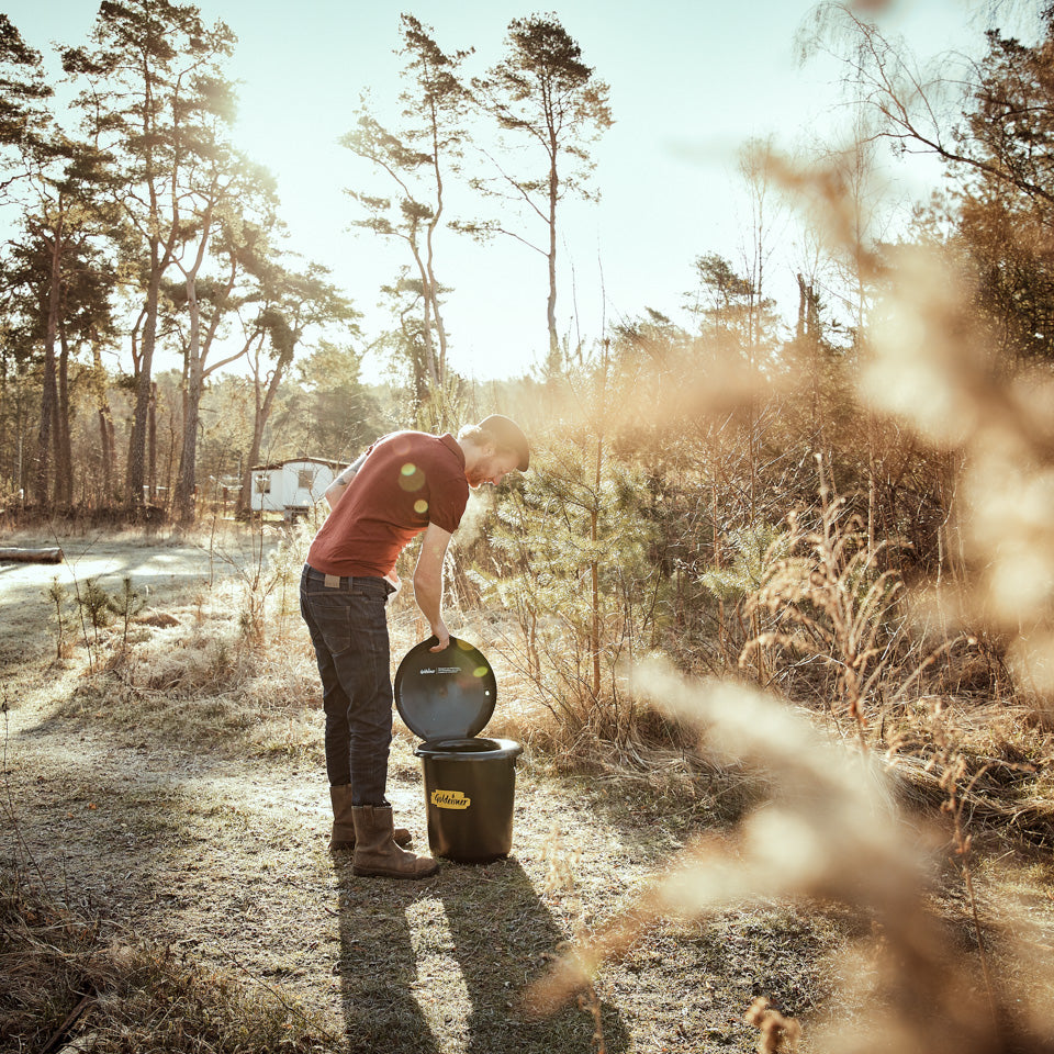 Wenn der Eimer 3/4 voll ist, solltest du ihn ausleeren. Falls du Goldeimer »Schietbüdel« verwendest, empfehlen wir, den Beutel für die Leerung nicht einfach aus dem Eimer herauszuheben. Die Beutel sind aus Maisstärke und beginnen sich nach maximal 14 Tagen langsam zu zersetzen und könnten reißen.