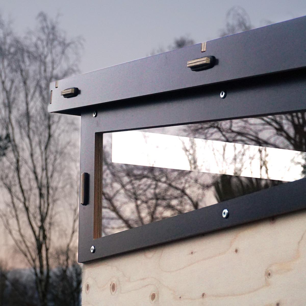 Das überständige, verzinkte Metalldach schützt das mit Naturfarben behandelte Holz vor Tropfwasser. Zwei Fenster und eine Öffnung mit Mückennetz zur Belüftung der Kabine bieten Licht und Luftzirkulation für einen reibungslosen Ablauf.