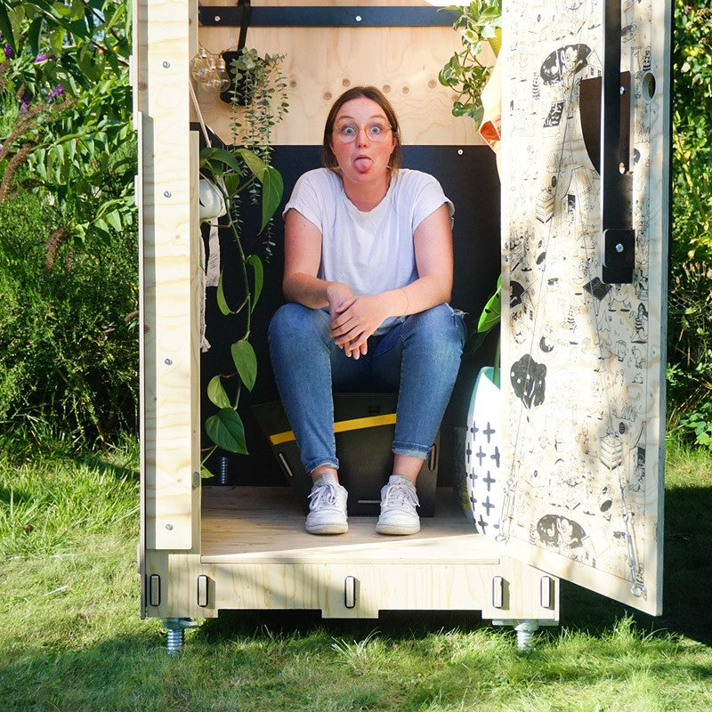Hier ist sie: unsere komfortable, praktische Holzkabine für deine Trockentoilette im Garten.